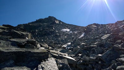 Sono ancora in vacanza dai miei e così mi raggiunge Max, come due anni or sono, e se in principio l'idea era di andare al Cistella, chiusi gli impianti di risalita, si decide di venire in Sempione e di salire l'immensa pietraia dello Hubschhorn…. giornata stupenda, lieve brezza fresca in quota, caldone infernale in basso.. saliamo seguendo una traccia che si rivelerà sbagliata… portandoci fuori percorso, salvo poi renderci conto che… qualcosa non torna…